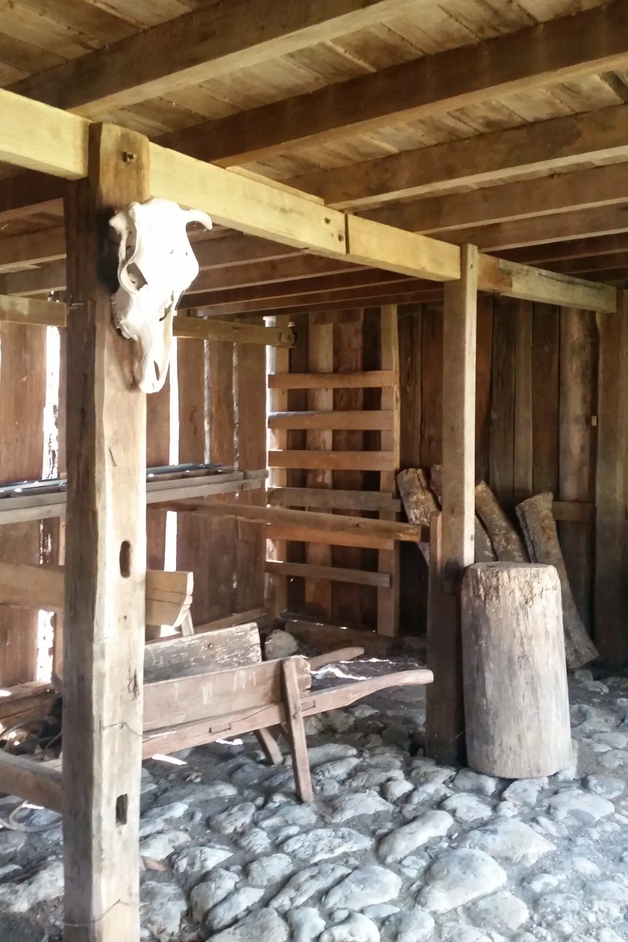 Stables with adze hewn posts, hardwood slab walls and stone floor.